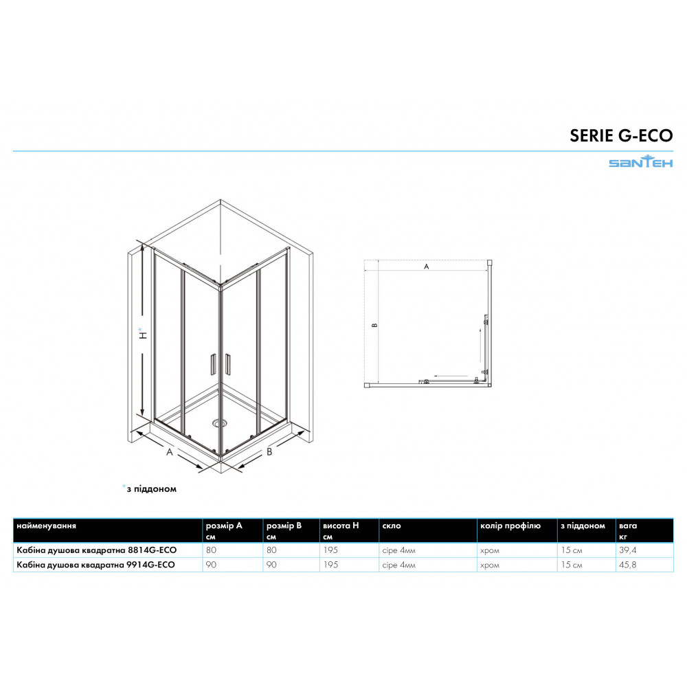 Опис Кабіна душова квадратна 9914G-ECO з піддоном 15см 90х90х195 скло сіре, профіль хром придбати за кращою ціною від SANTEH в магазині St-Lviv