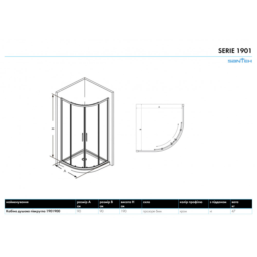 Опис Кабіна душова півкругла 1901900 90х90х190 скло прозоре, профіль алюмінієвий хром придбати за кращою ціною від SANTEH в магазині St-Lviv