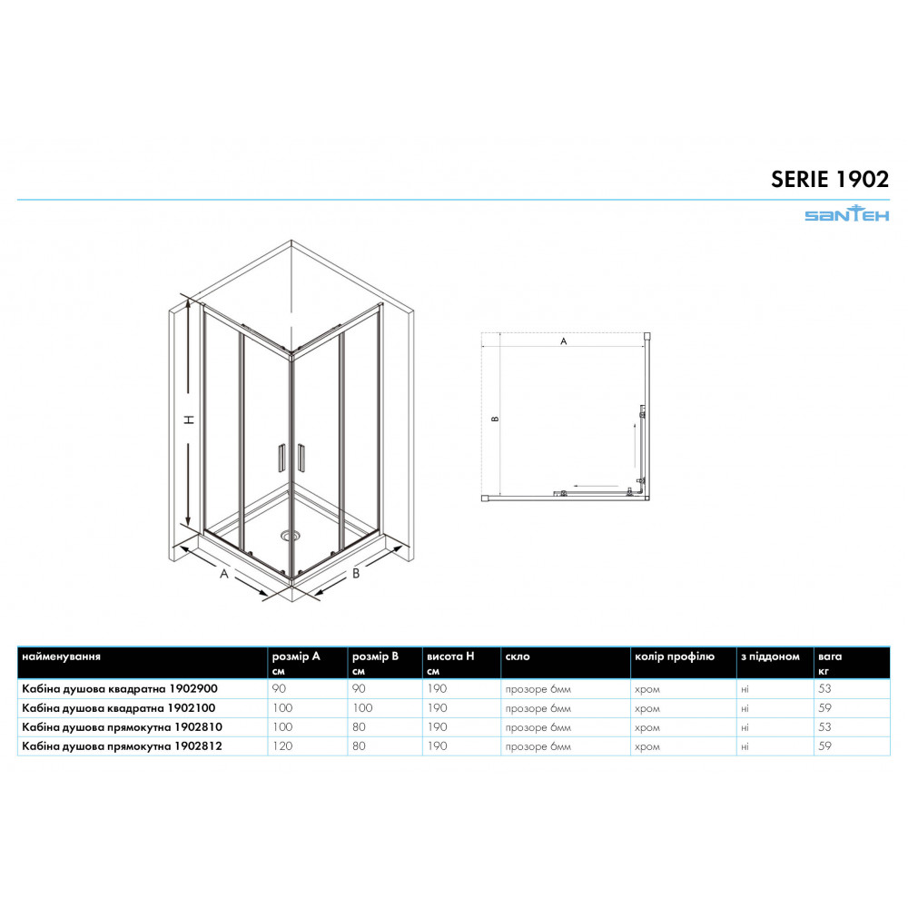 Опис Кабіна душова квадратна 1902100 100х100х190 без піддона, скло прозоре, профіль алюмінієвий хром придбати за кращою ціною від SANTEH в магазині St-Lviv