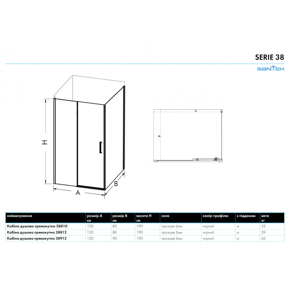Опис Кабіна душова прямокутна 38810 100х80х190 без піддона скло прозоре 6мм, профіль алюмінієвий чорний придбати за кращою ціною від SANTEH в магазині St-Lviv