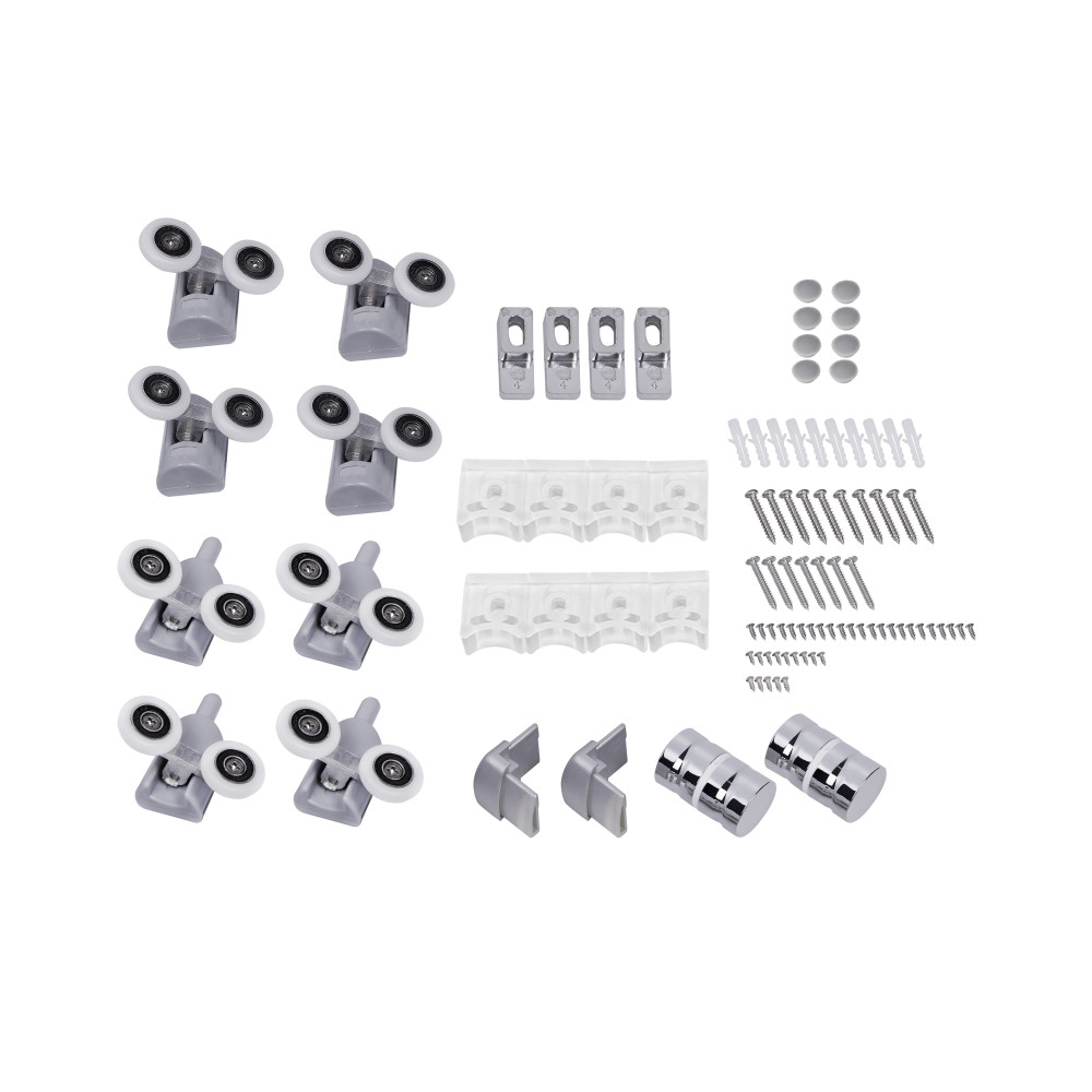 | Комплектація | Профіль, подвійні ролики, ручки, комплект кріпильних деталей, глухе скло, скляні двері, піддон, сифон, ніжки, панель для піддону. |