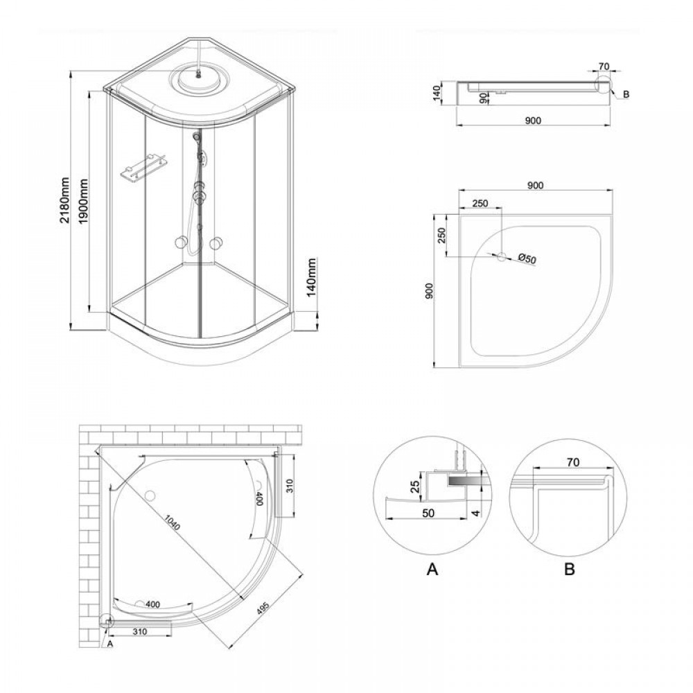 Комплектація: Піддон, сифон, двері, ручки, ролики, профіль, комплект кріплень, задня стінка, панель, змішувач, лійка для ручного душу, лійка для верхнього душу, душовий шланг, кронштейн, ніжки, верхня кришка, скляна полиця.