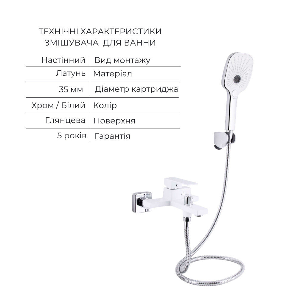 Акційний комплект із змішувача для раковини та змішувача для ванни з душовим гарнітуром. Серія виконана у поєднанні хрому та білого кольору, що підкреслює сучасне оформлення інтер'єру.