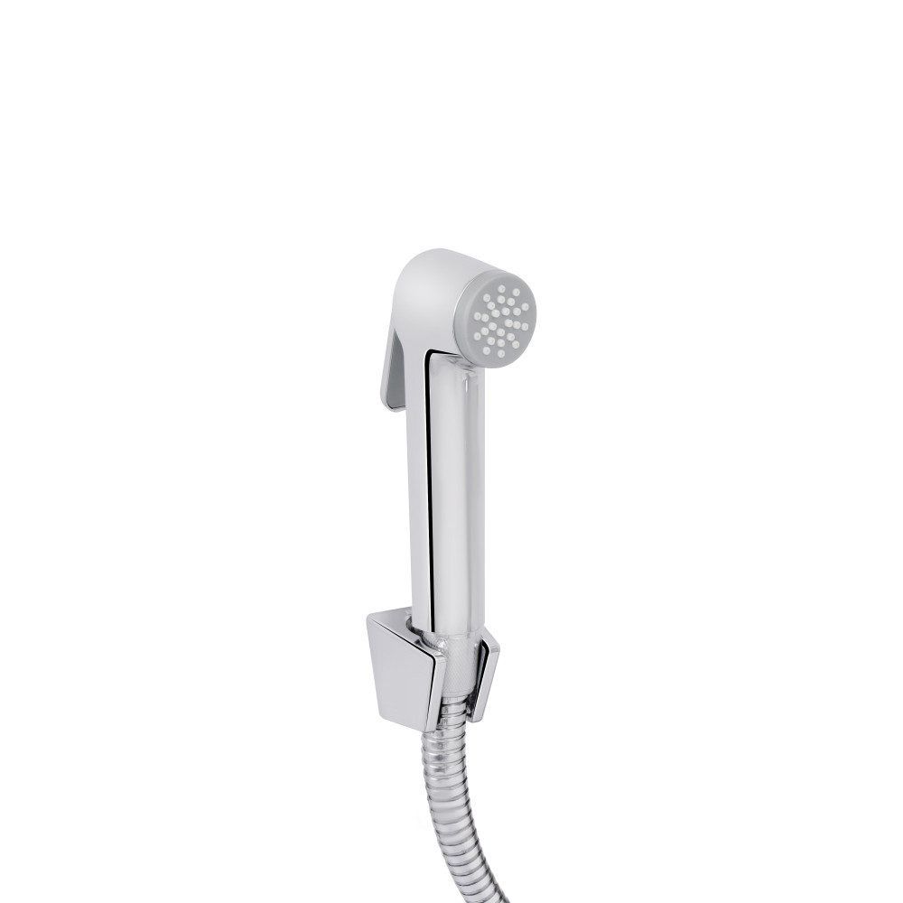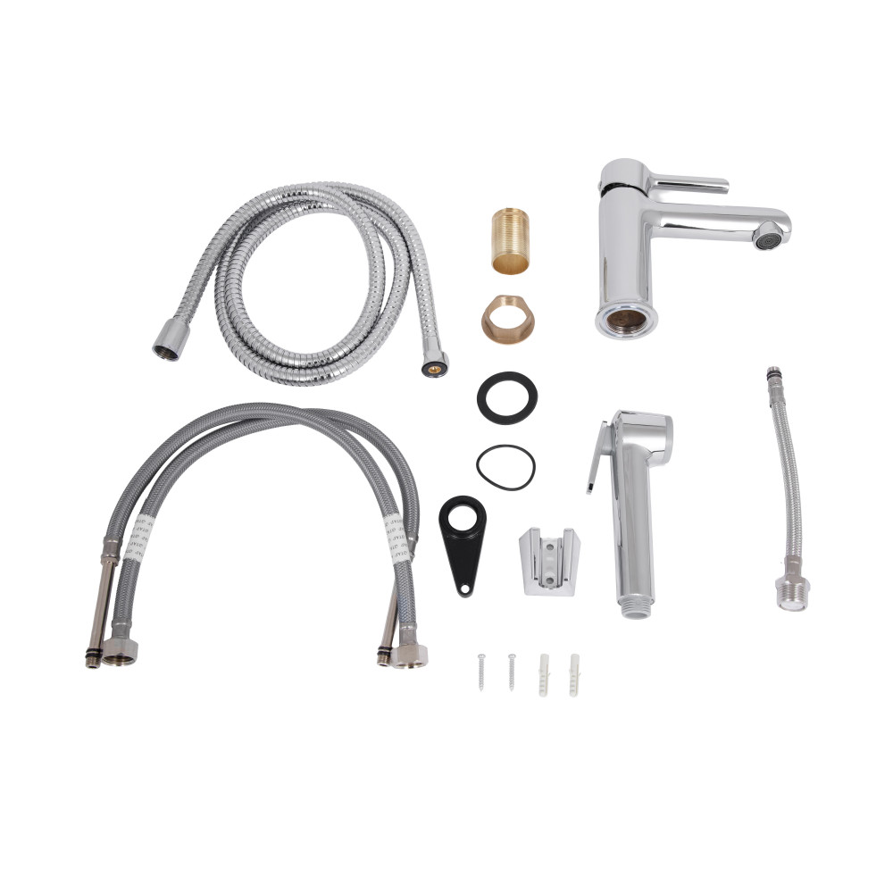 Комплектація: Змішувач, гнучкі підводки, гігієнічний душ, тримач для душу, елементи кріплення.