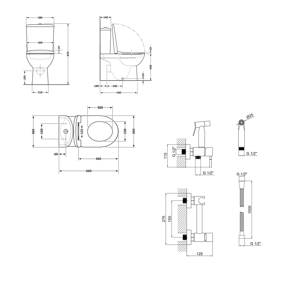 | Матеріал | Кераміка – унітаз, бачок; дюропласт – сидіння; нержавіюча сталь - набір для гігієнічного душу |