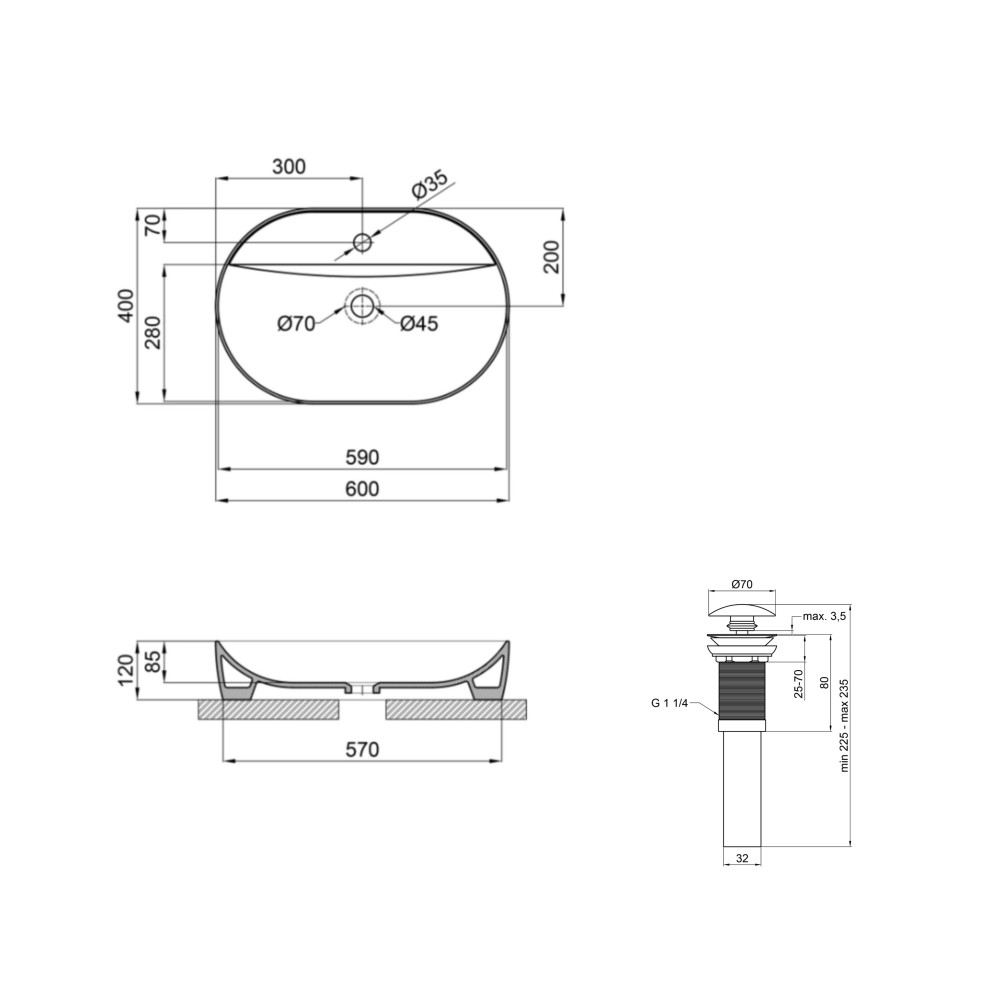 | Габаритні розміри виробу (ШхГхВ), мм | 600х400х120 – раковина; 70х70х225 - донний клапан |