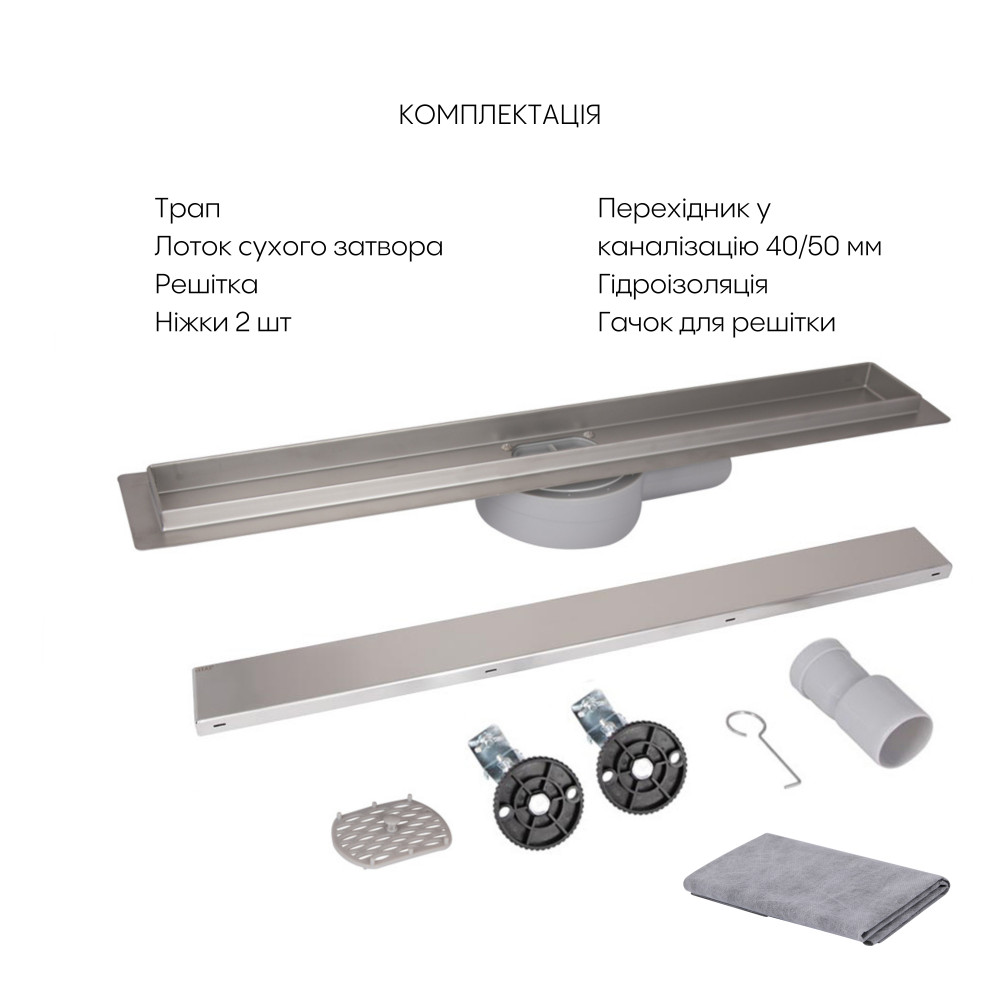 Комплектація: Трап, лоток сухого затвора, ґрати, ніжки (2 шт), перехідник у каналізацію 40/50 мм, гідроізоляція, гачок для ґрат.