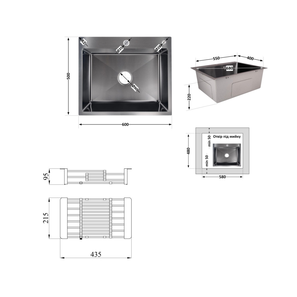 | Матеріал | Нержавіюча сталь - мийка; нержавіюча сталь / пластик - кошик |