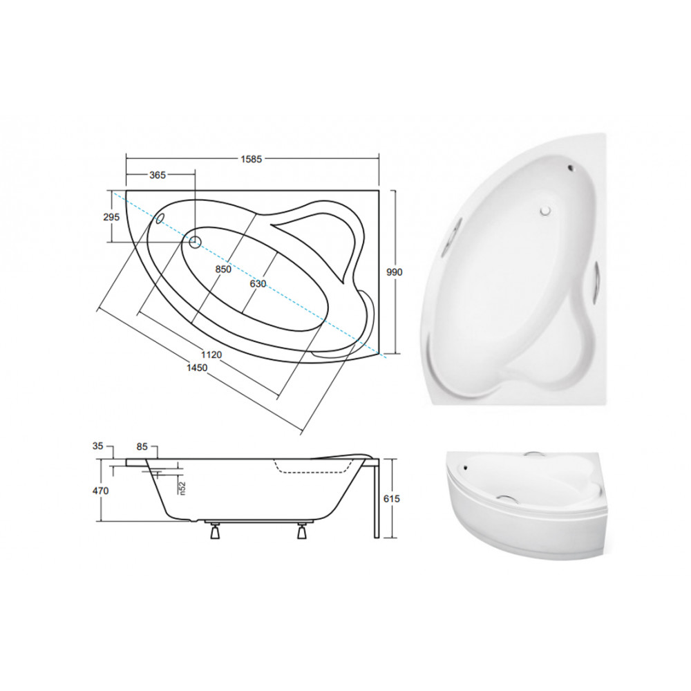 Опис Ванна акрилова ADA 160х100 права, без обудови і ніг, З отворами під ручки