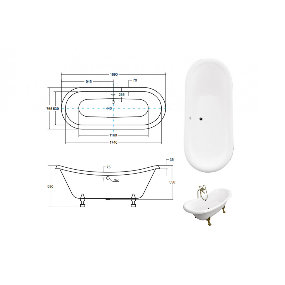 Ванна AMELIA ретро 190х77 чорна зовні, біла всередині, з двома отворами, з ногами білими (#12787-01)