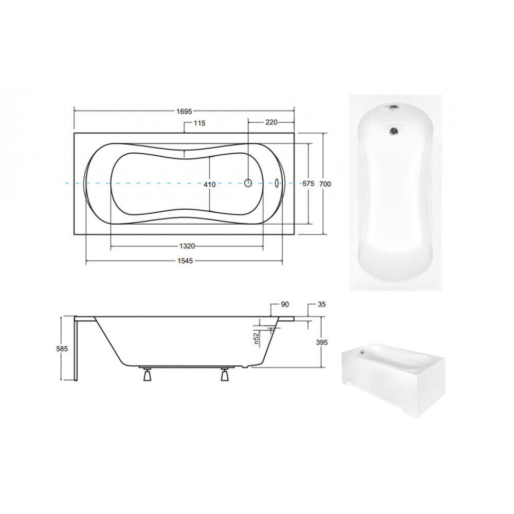 Опис Ванна акрилова ARIA PLUS 170х70 (соло) без ніг, з ручками і з отворами