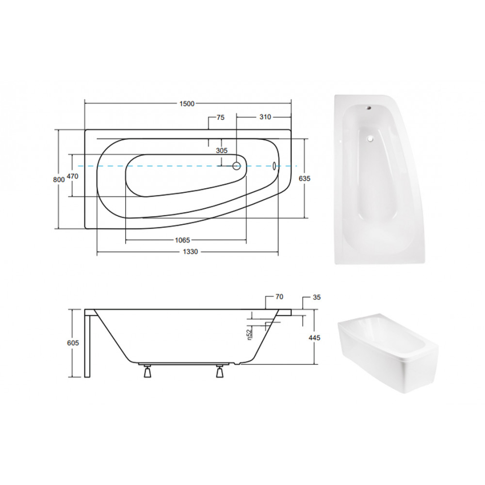 Опис Ванна акрилова LUNA 150х80 Ліва (соло) без ніг