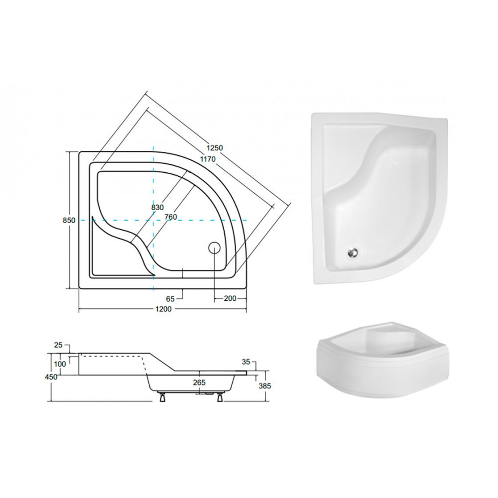 Опис Піддон півкруглий MAXI 120x85х24/38,5 Р правий + ноги