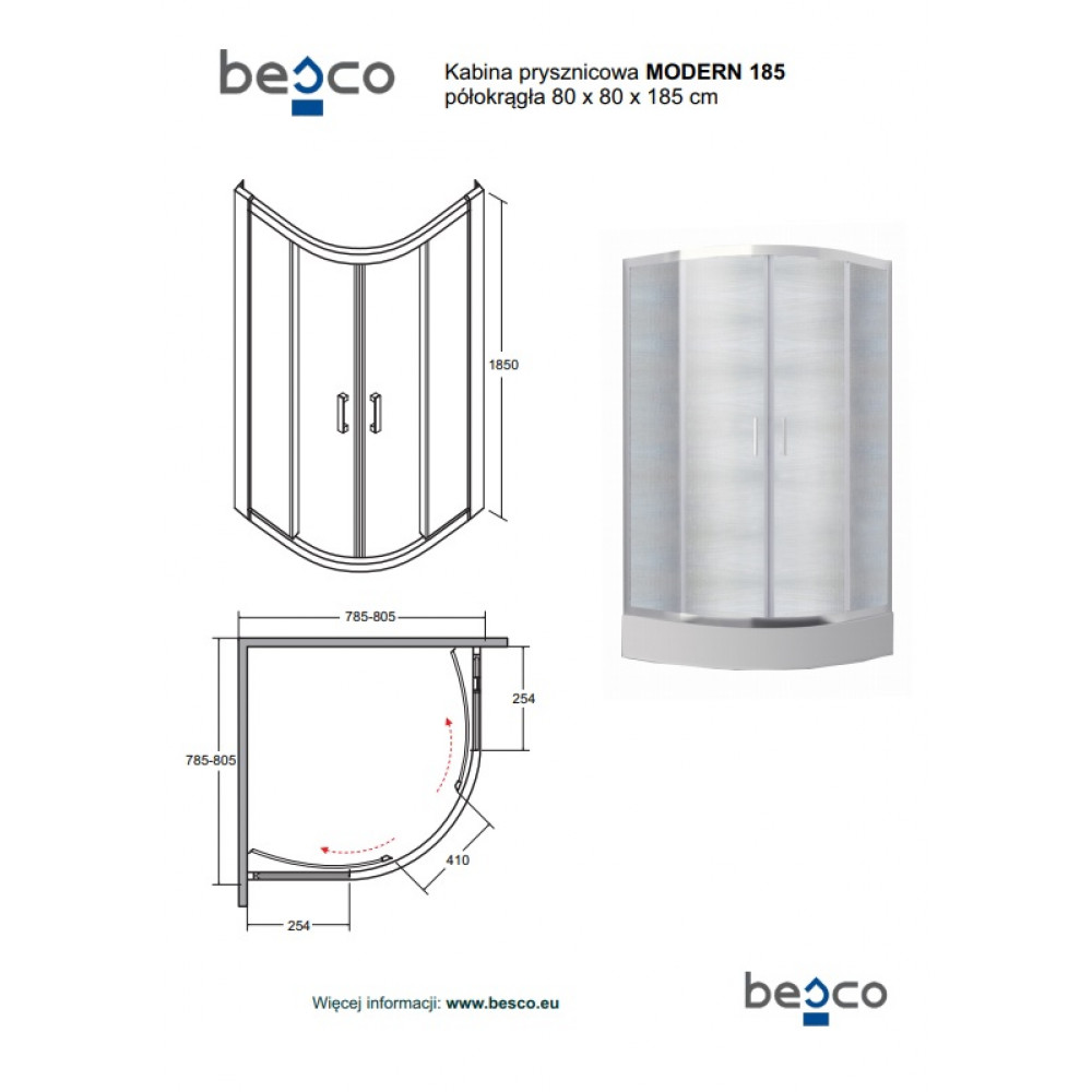 Опис Кабіна півкругла MODERN 90x90x185 універсальна: скло прозоре, профіль хромований