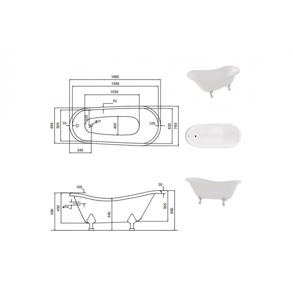 Опис Ванна акрилова OTYLIA ретро 170х77 з 2-ма отворами (злив і перелив) з ногами хром, без сифона