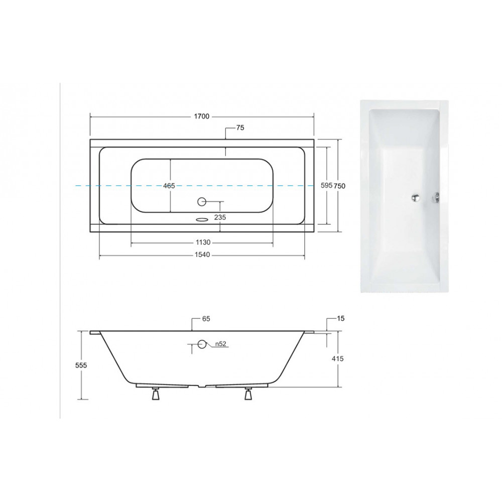 Опис Ванна акрилова QUADRO SLIM 170х75 без ніг, БЕЗ отворів під ручки, без ручок