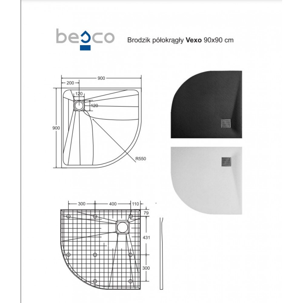 Опис Піддон півкруглий VEXO 90х90 чорний + сифон