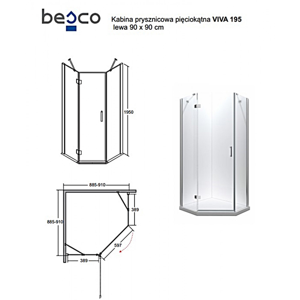 Опис Кабіна п’ятикутна VIVA 90x90x195 ліва: скло прозоре, профіль хромований