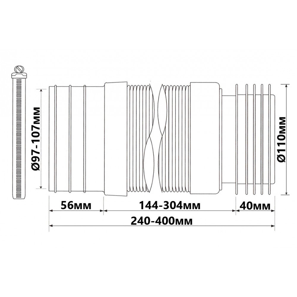 Опис Гнучке пластик.з'єд. розтяжне L260-420mm 110mm без фланц. прокл.з мет.хомутом WC-F23RJ