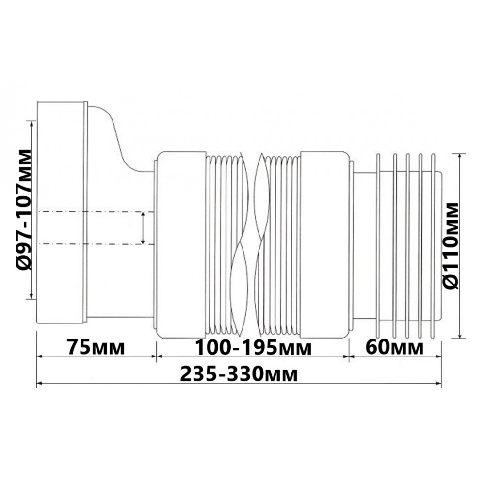 Опис Коліно-підключення еластичне до WC зміщене на 20 мм з ущільненням L-110 мм WC-CON4F