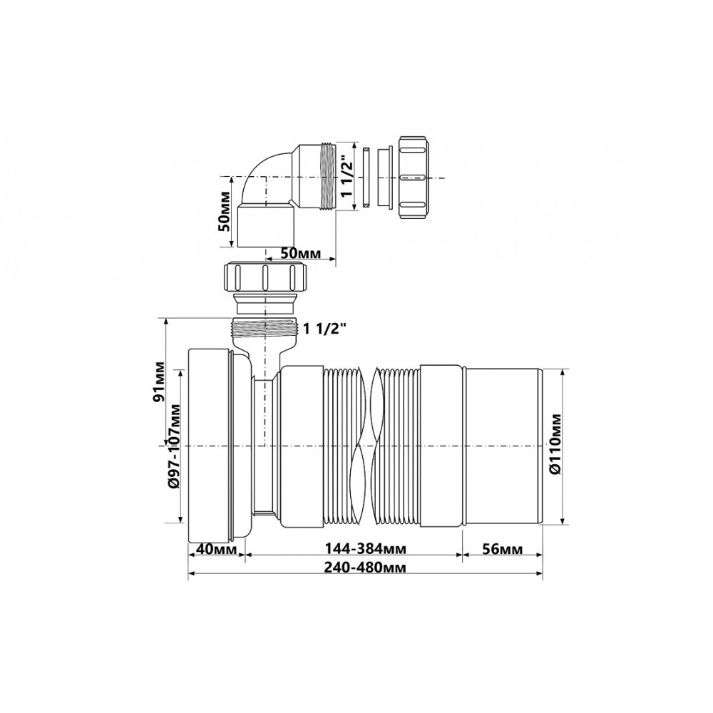 Опис Труба розтяжна до унітазу L 240-480 мм, з бок.відводом 40мм WC-F23PD