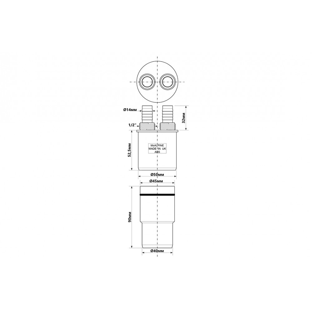 Опис Адаптер для підключення зливу з двома входами 14мм/1/2", вихід 40/50 мм,MA15-2-4050