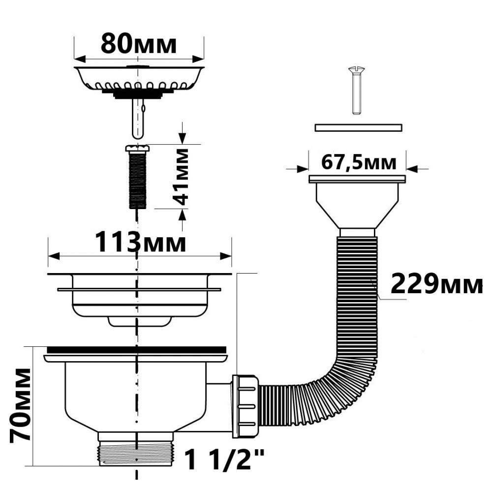 Опис Злив пластиковий для кухонної мийки з сіткою з нержавійки 1 1/2*113 mm FSW50PDR