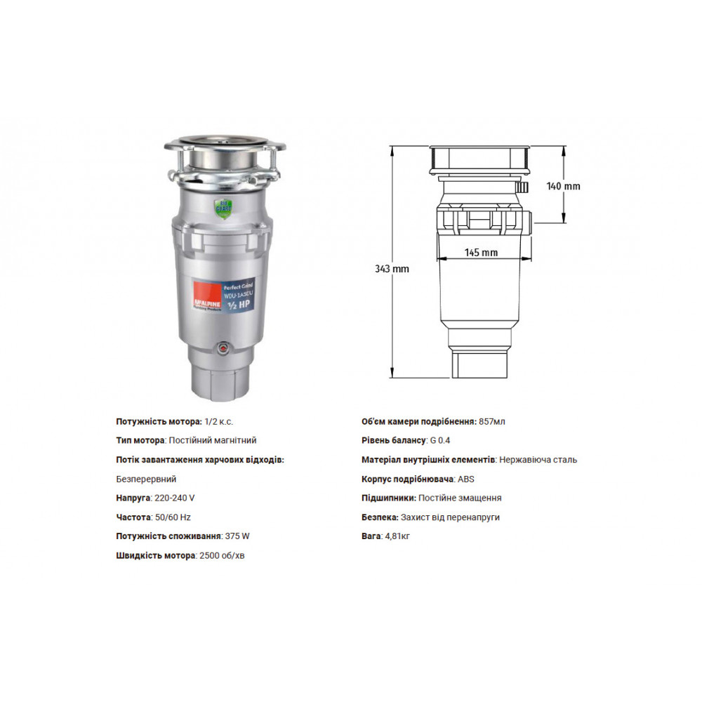 Подрібнювач харчових відходів з пневматичним перемикачем WDU-1ASEU-POL (#13800-24)