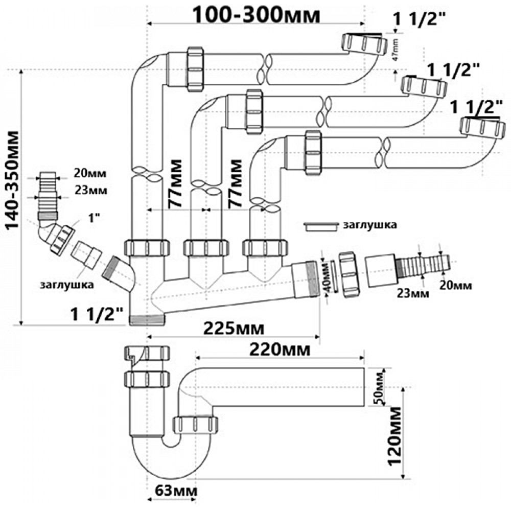 Опис Сифон для кухонної мийки багатофункційний SSK3-50