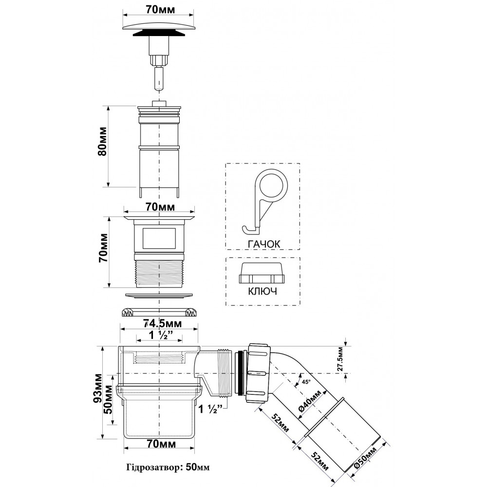 Опис Сифон для піддона 50mm "клік-клак" накладка з латуні 70*40/55мм HC26-IOF-95-CB