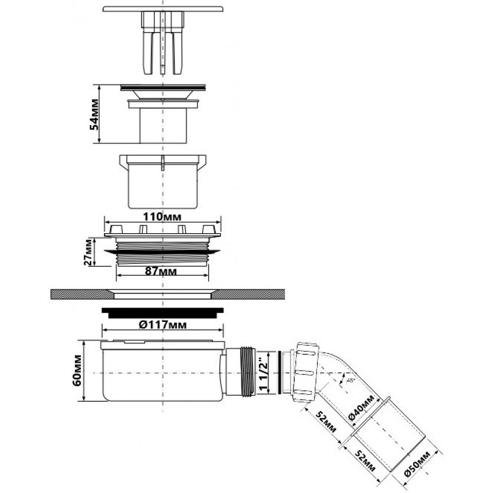 Опис Сифон для піддона d90мм, h60мм, вихід 40/50, хром HC2730LCPN-PB