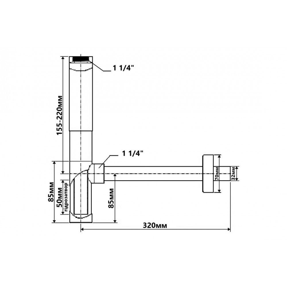 Опис Сифон для умивальника без зливу 1.1/4″x32мм, латунь, хромований, без зливу, з ревізією, 203