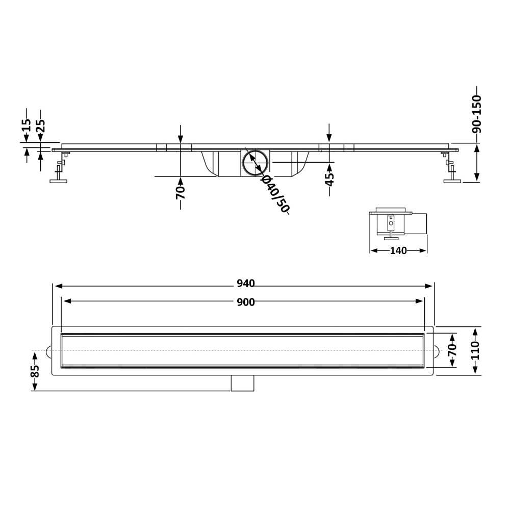 Характеристики Лінійний трап із нержавіючої сталі Scorpio Tile900 під плитку (поворотний сифон/сухий затвор) Qtap