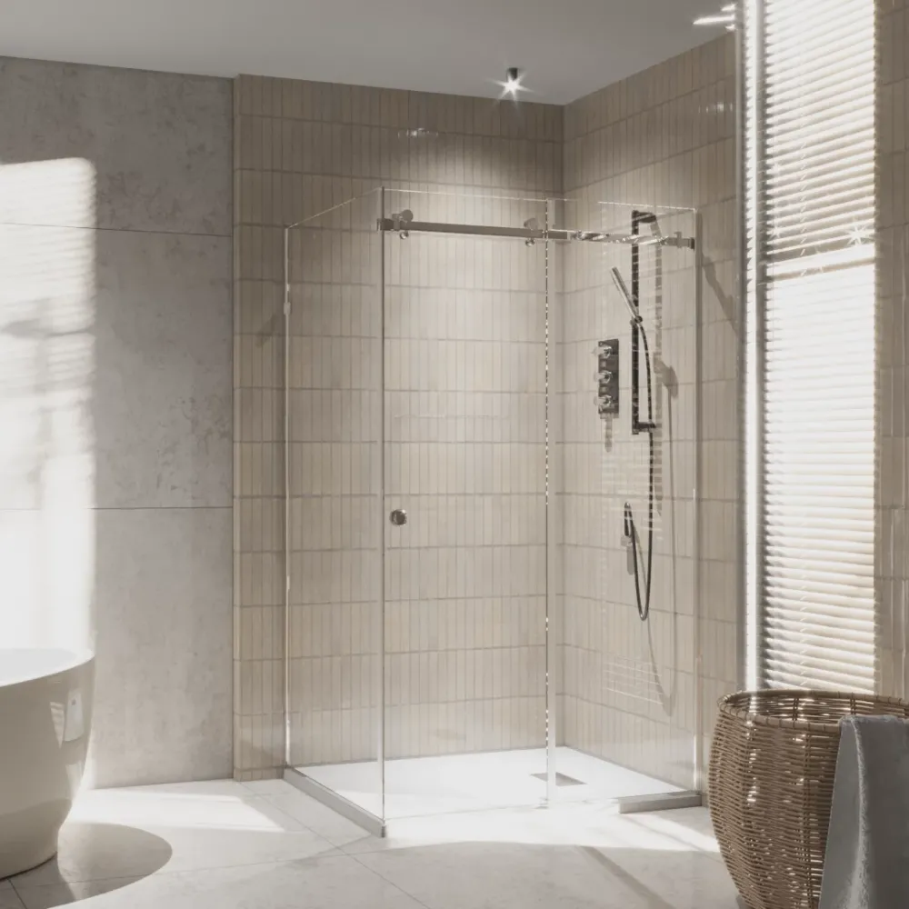 Кутова душова може мати різні розміри: від 80х120 до 100х120 см. Ви можете замовити її на сайті, скориставшись нашим калькулятором та безкоштовною доставкою навіть такої габаритної продукції. Двері для душу розсувні, а отже Ви зекономите простір, що є ще однією перевагою даної моделі. Прозорі великі двері мають круглу, стильну ручку, що не порушує мінімалістичний дизайн душової.