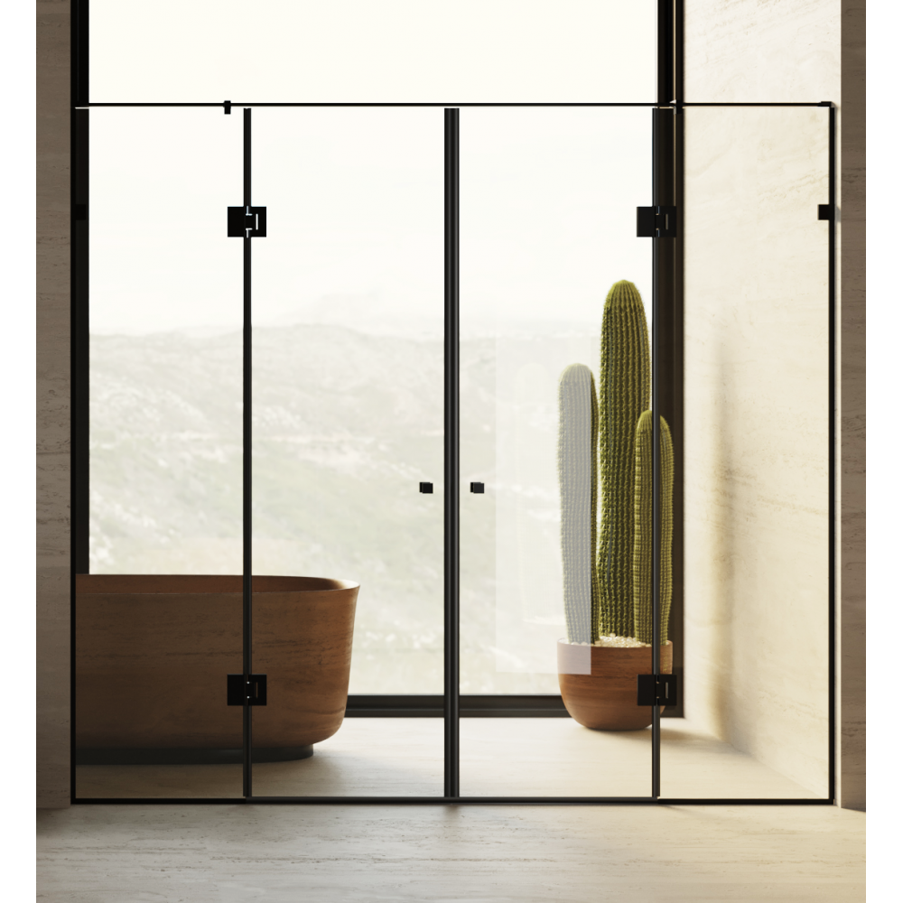 Чотирьохсекційні двері для душової кабіни виконані з гартованого скла, яке у поєднанні з нержавіючою сталлю має неймовірний, сучасний вигляд. Скло може бути як прозорим, так і матованим, а ще – мати додаткове покриття. Скляні двері тримаються на сталевих петлях. У даній моделі дві секції є стаціонарними, а дві рухаються, виконуючи функцію дверей, це дуже зручно та практично.