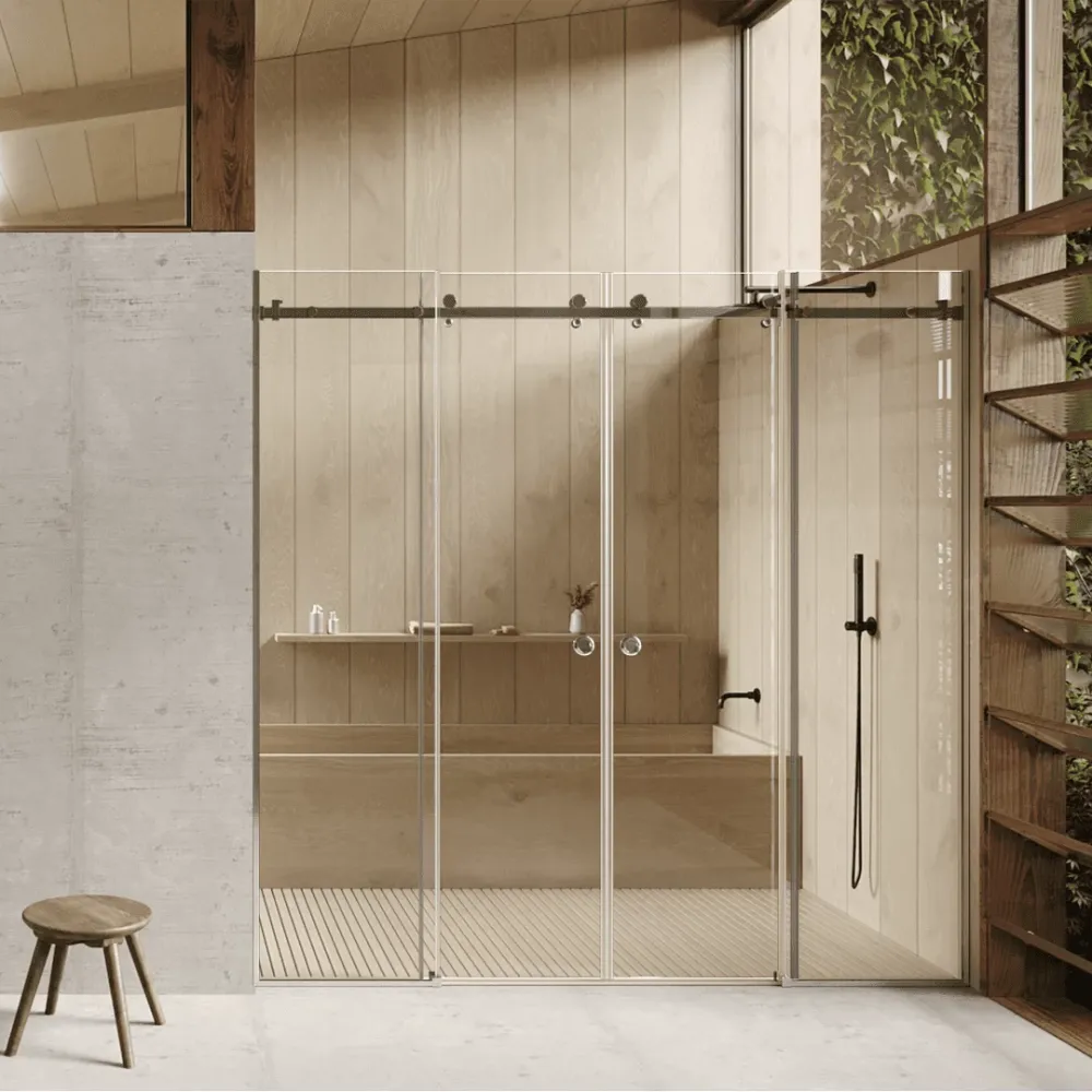 По-перше, візуально скляна поверхня не обмежує простір, по-друге, сприяє проходженню світла в кімнату, а по-третє, саме роздвижний тип пересування конструкції не заважатиме при відкриванні дверей. Ви можете обрати підходящі розміри дверей. Дана модель складається з чотирьох секцій, дві з яких є мобільними, а дві стаціонарними.